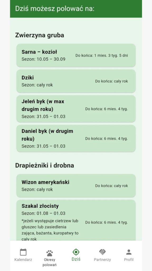 Wejdź do zakładki „Dziś możesz polować na” i sprawdź aktualną listę gatunków zgodną z Twoimi ustawieniami.