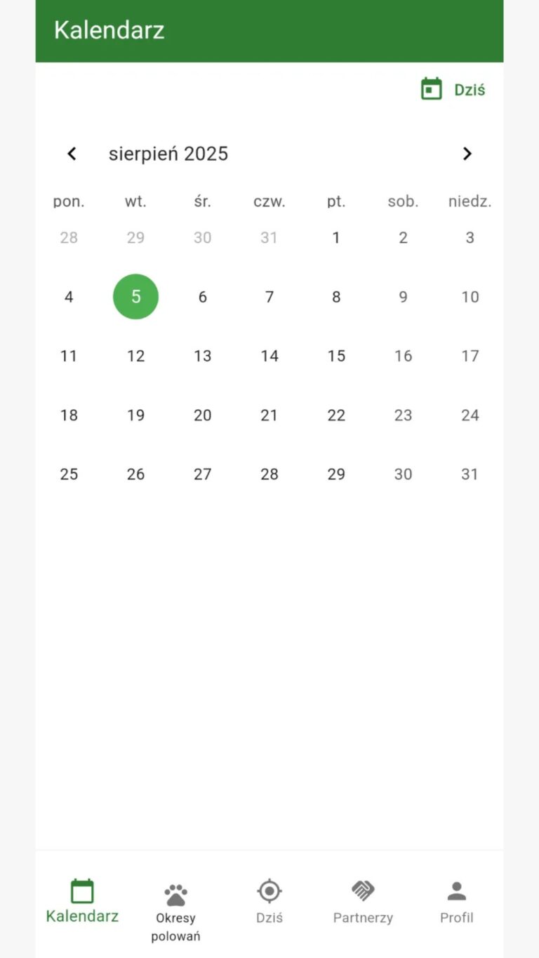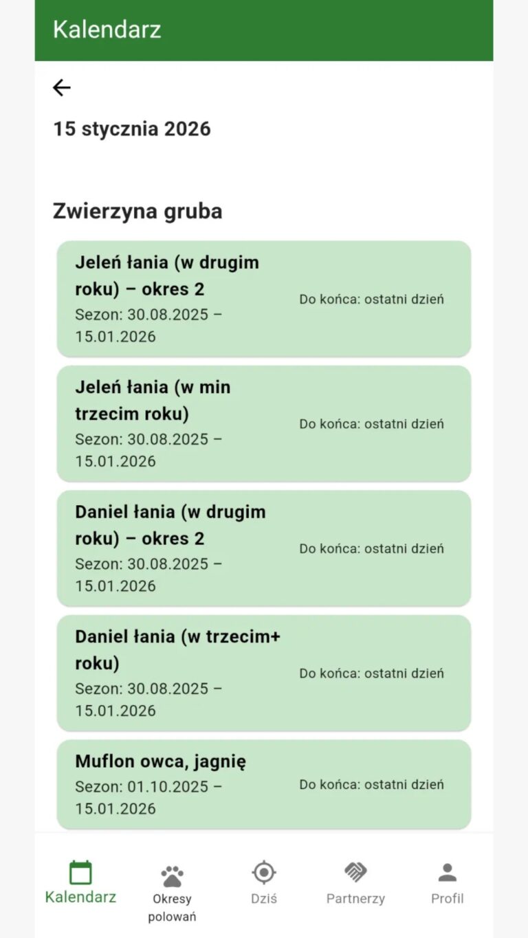 Wybierasz województwo. Zaznaczasz swoje uprawnienia. Aplikacja pokazuje, na co możesz polować dziś. W kalendarzu sprawdzasz konkretny dzień. A w zakładce „Okresy polowań” – pełne zestawienie zgodne z Twoimi ustawieniami.